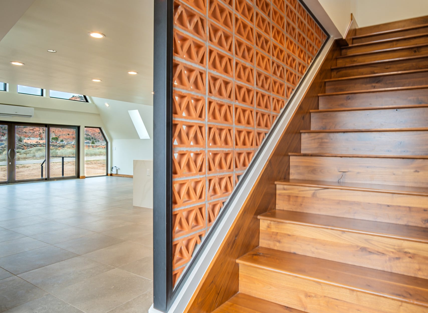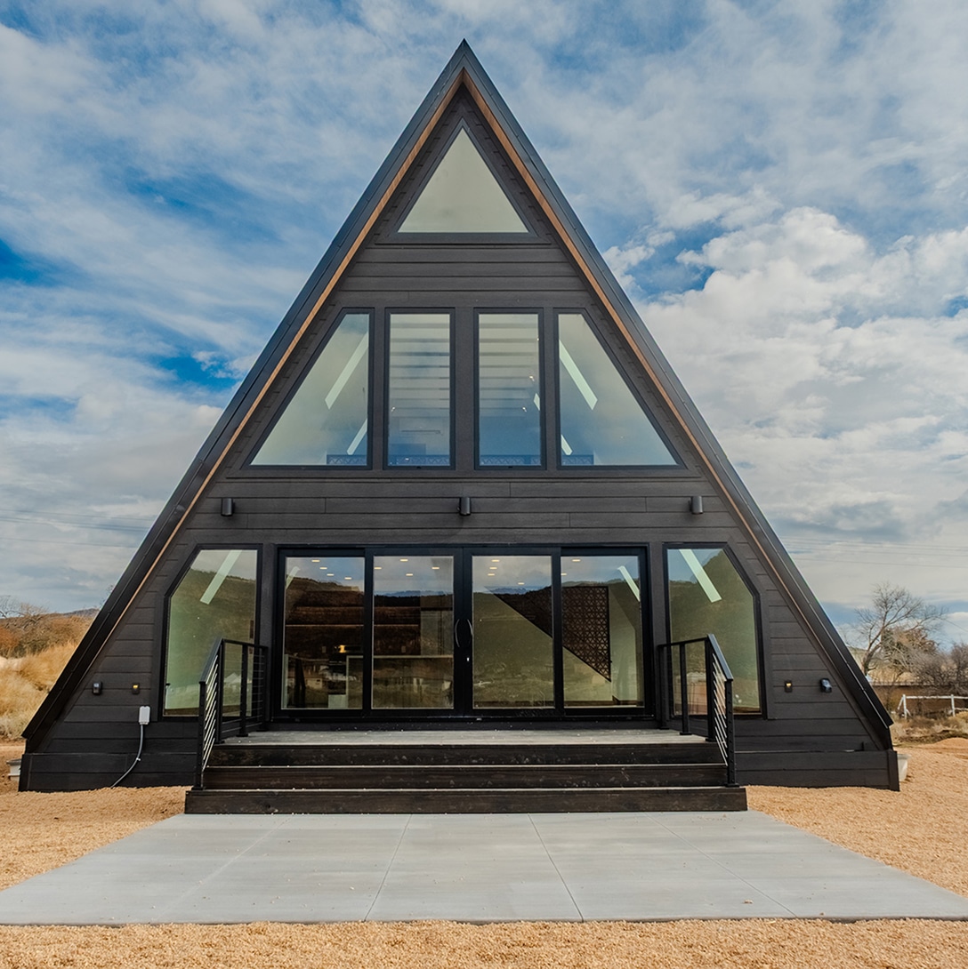 The A-Frame Retreat in Kanab blends modern design and precision craftsmanship. A full glass front and metal-framed doors flood the bespoke interior with natural light, offering panoramic views and seamlessly connecting the unique living space to the dramatic Utah landscape.