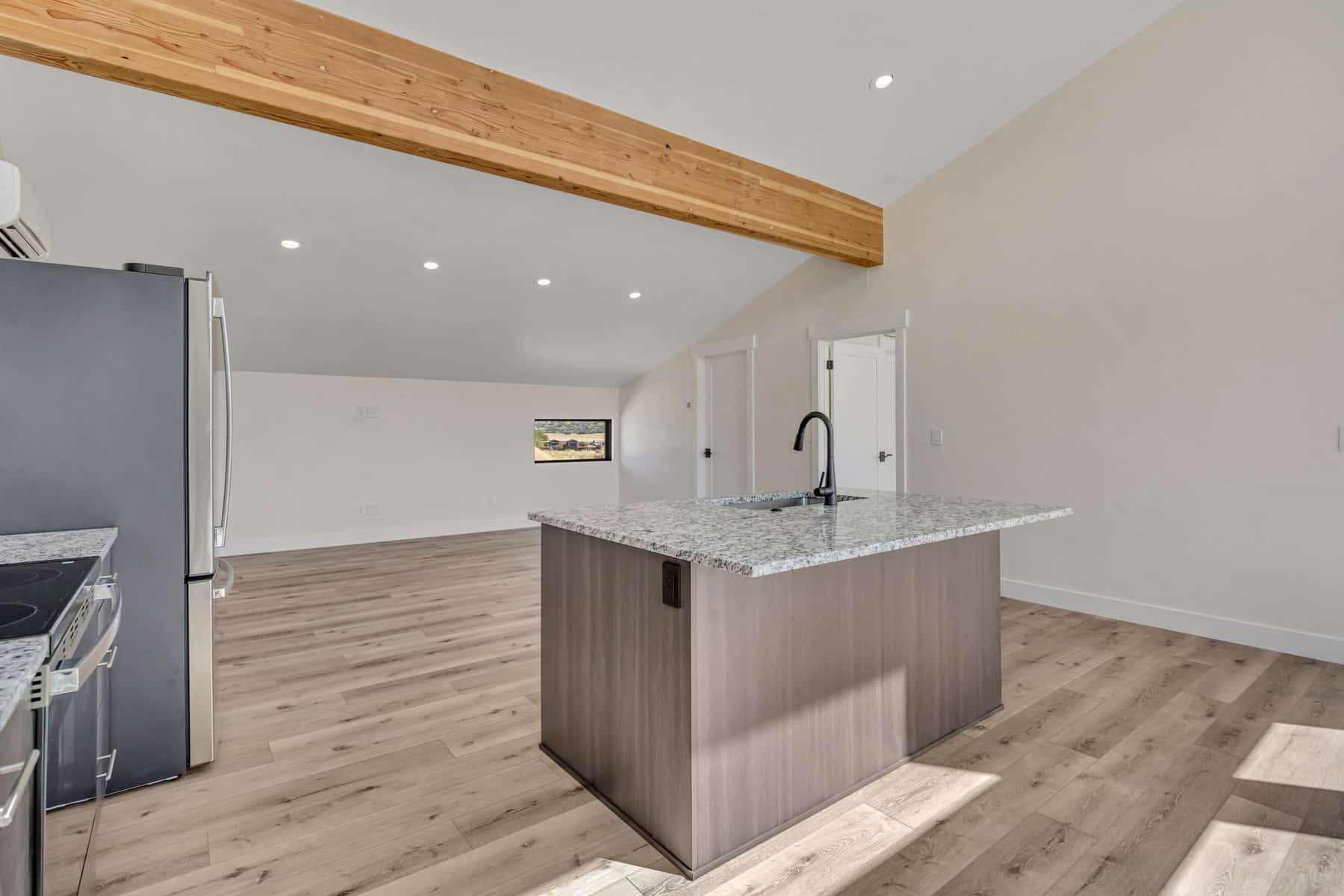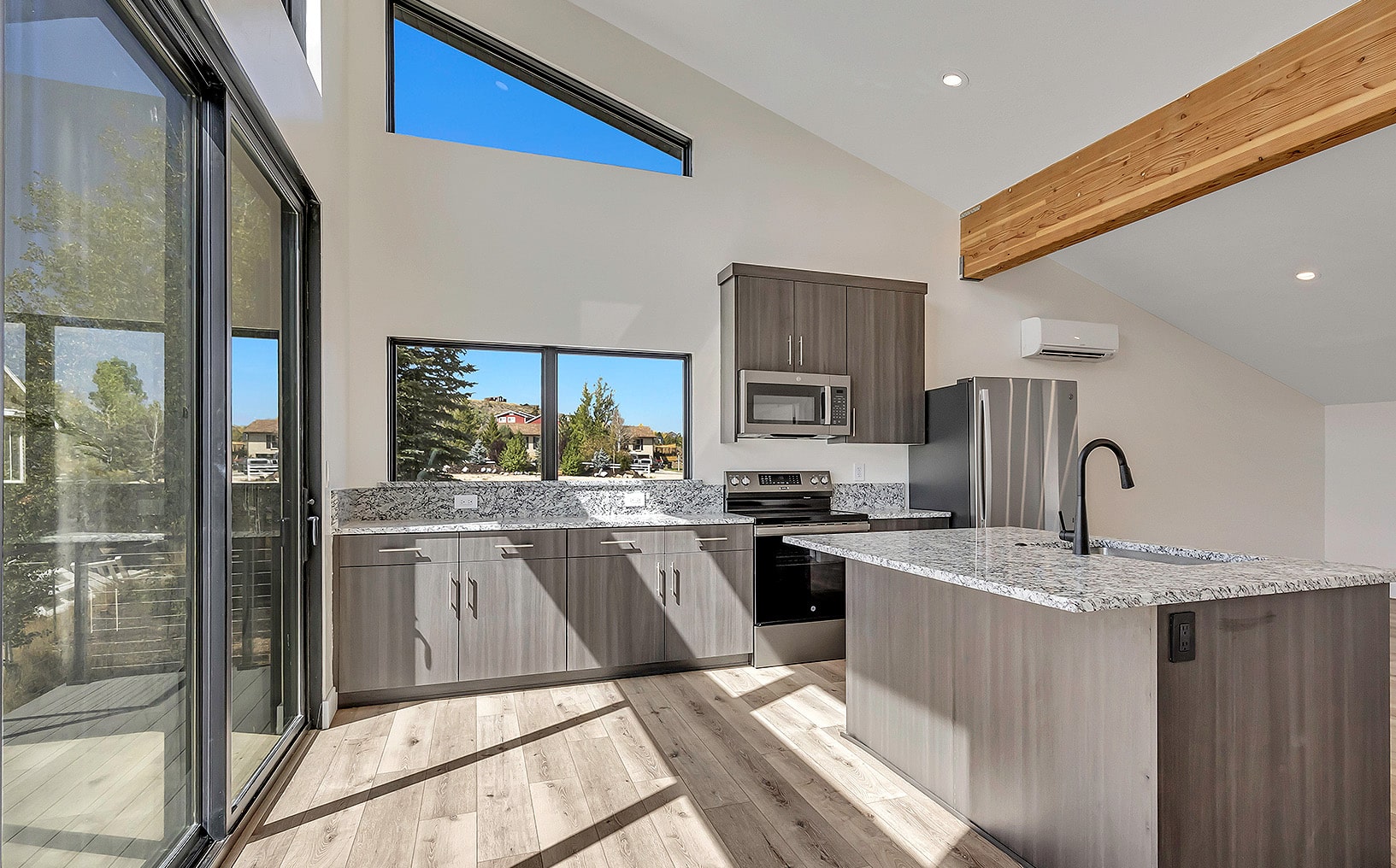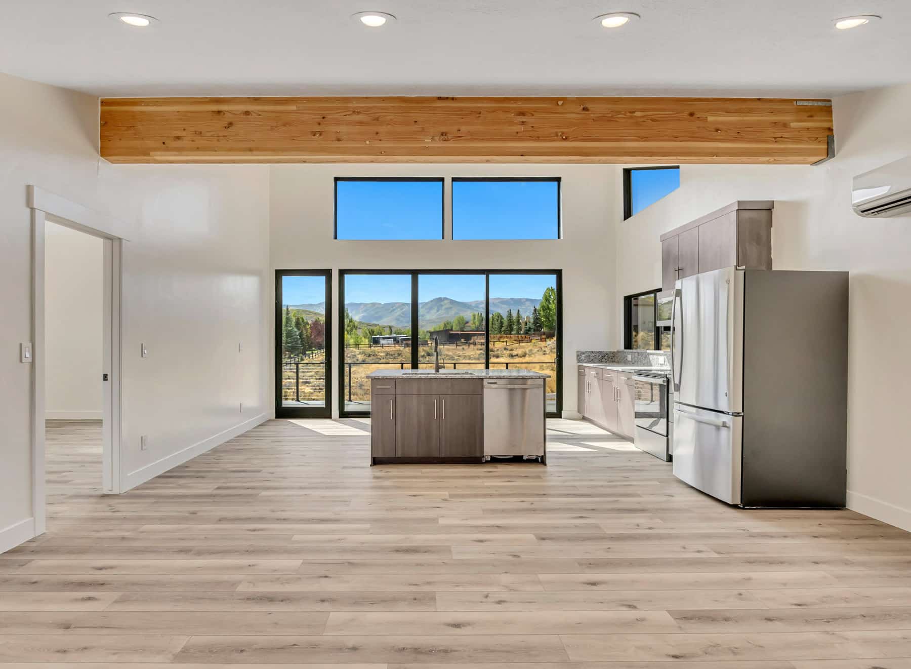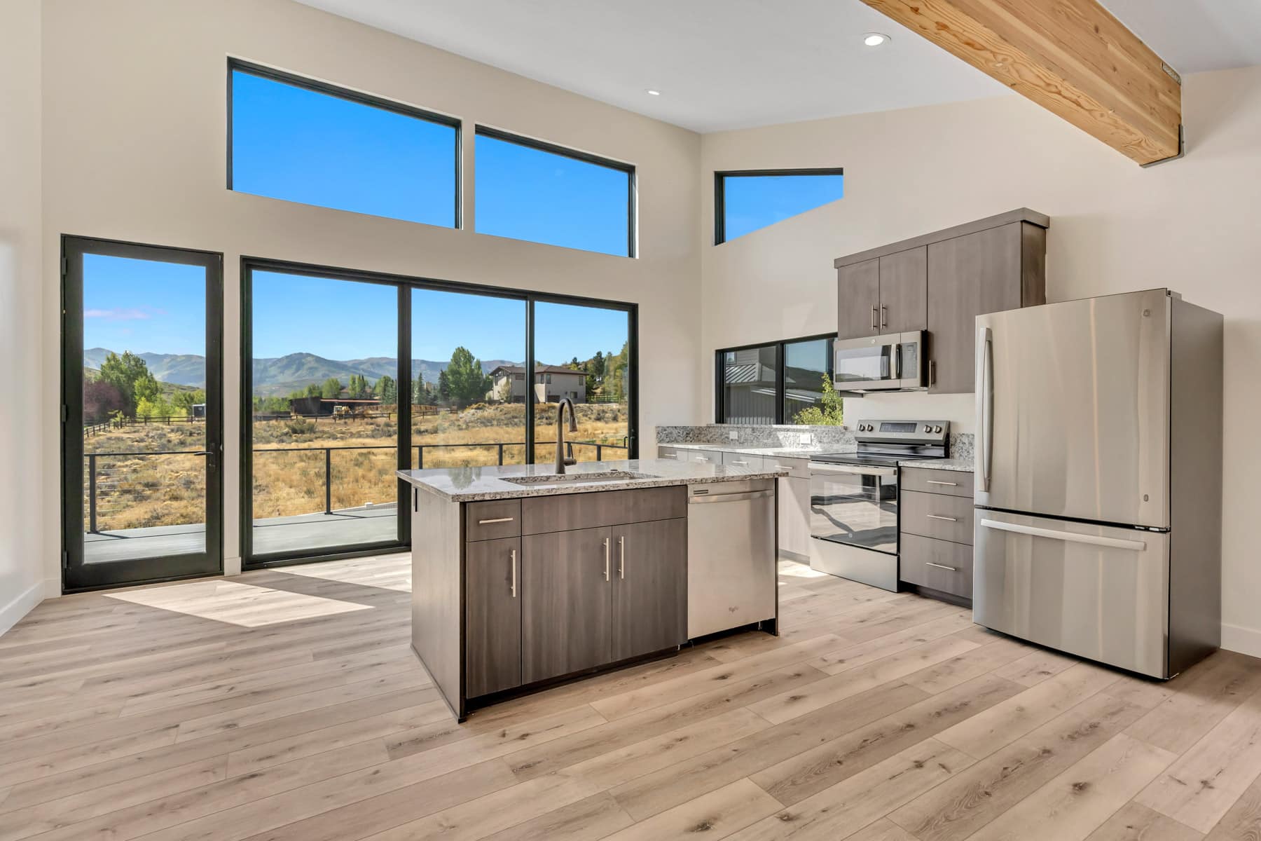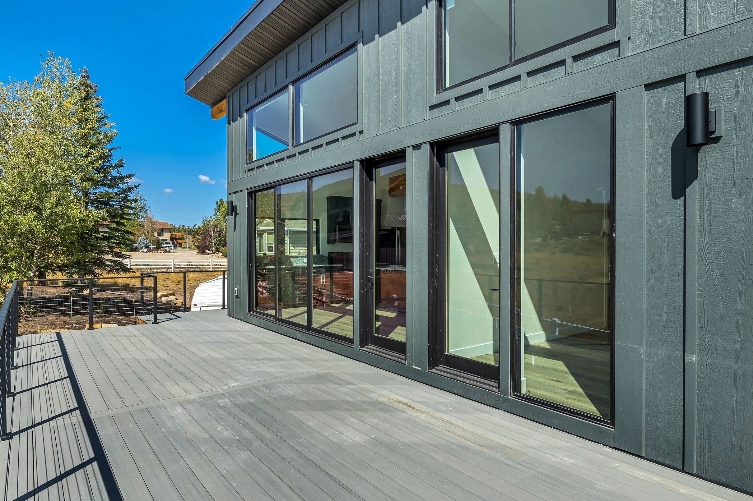 - Indoor-Outdoor Living: Expansive windows and large glass doors open to an elevated deck, creating a seamless connection to the outdoors.