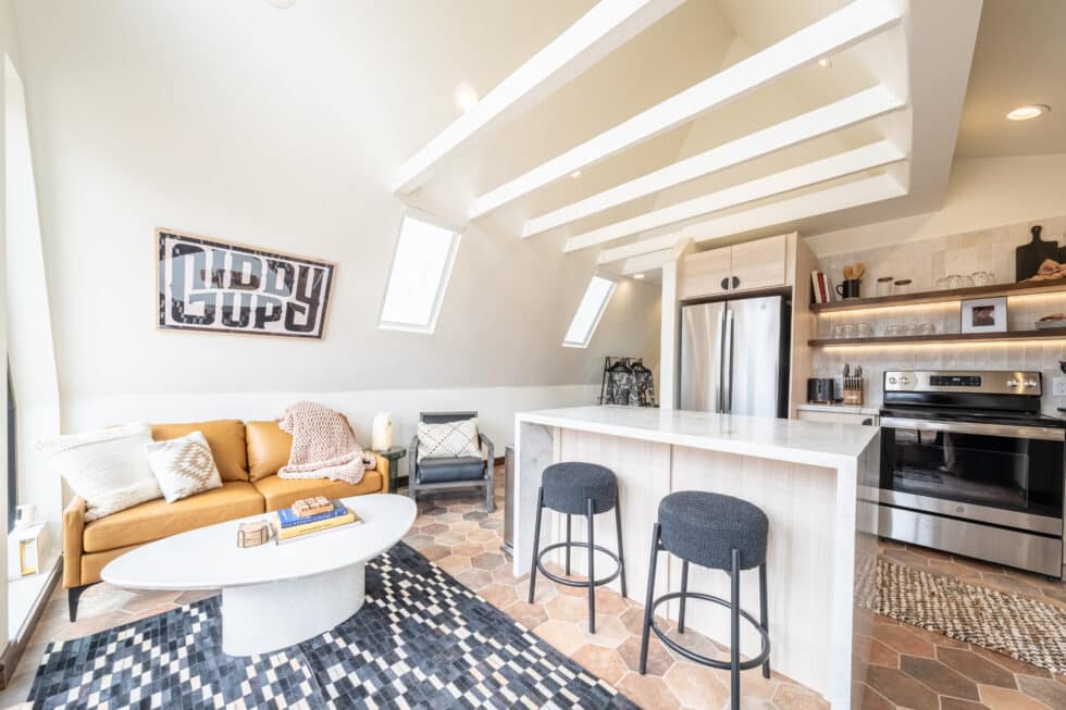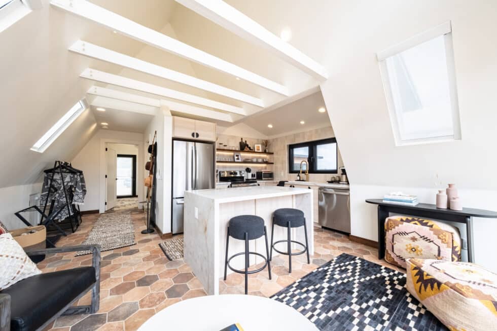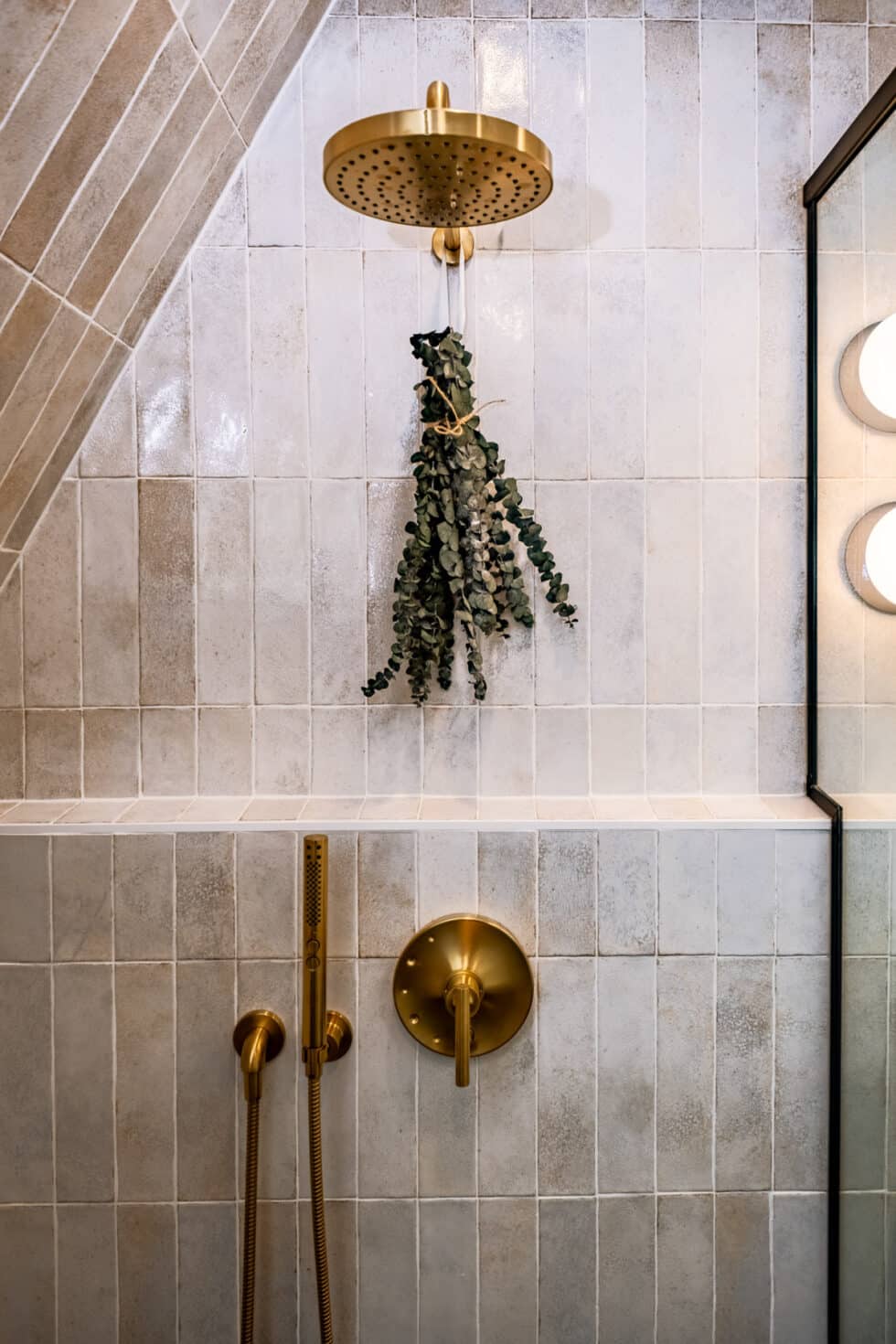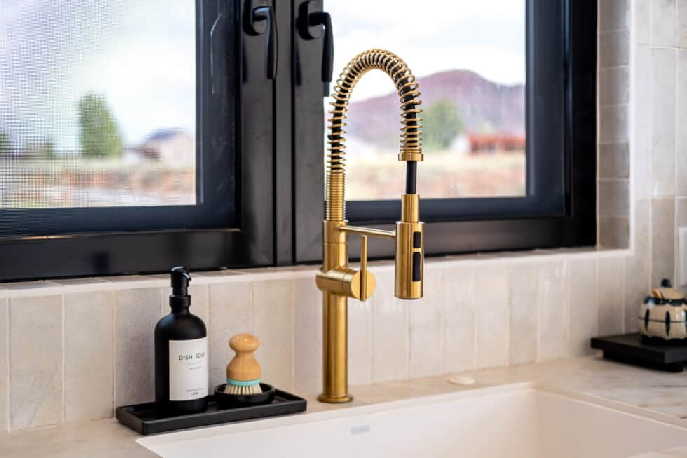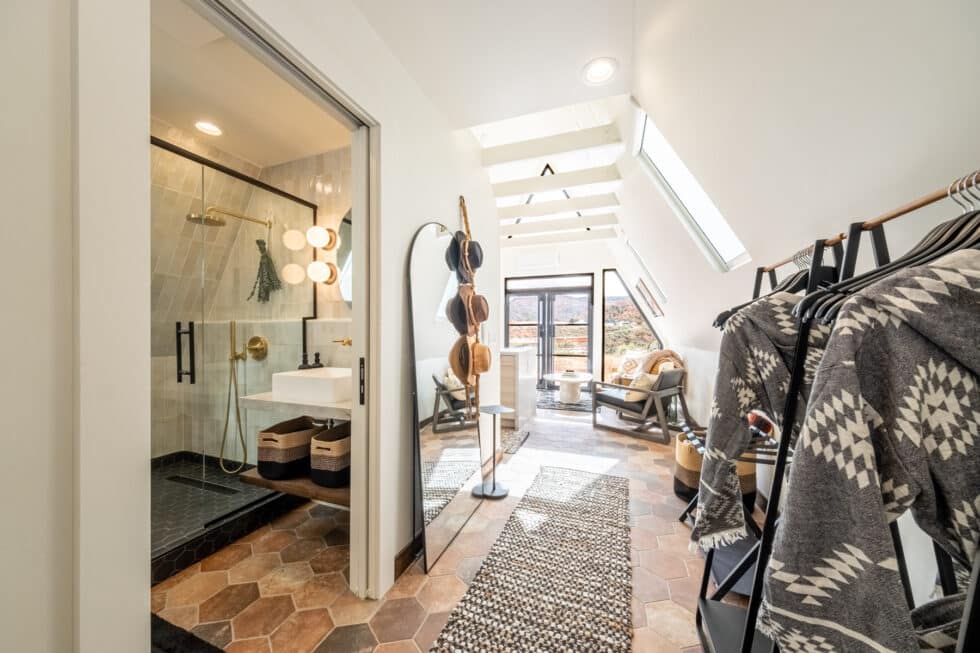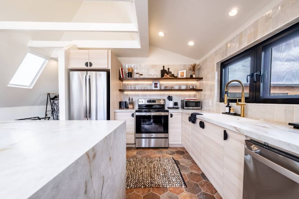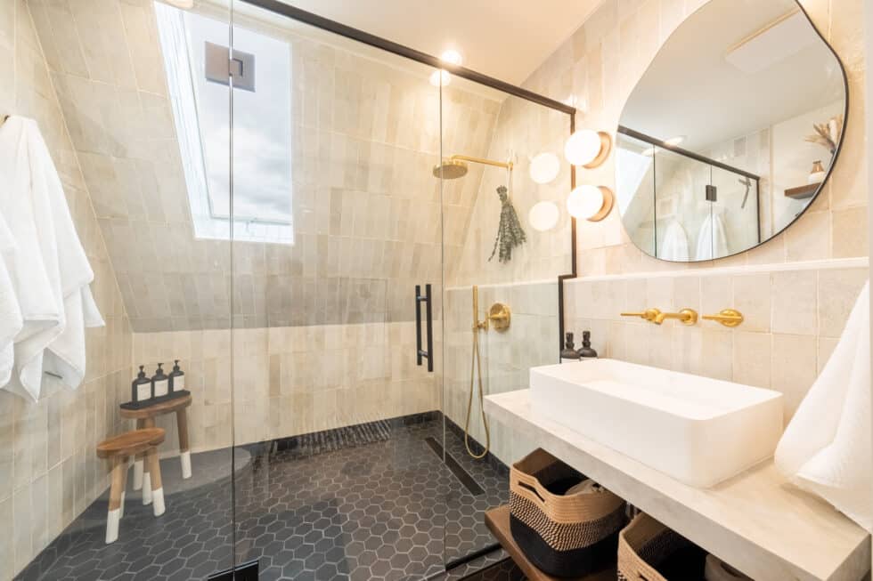 - Refined Finishes: This home showcases architectural brass fixtures, deliberately highlighting plumbing components and turning them into stylish design elements, adding elegance and visual appeal. The 8-inch hex tile flooring, used throughout, offers a striking look with its durable, modern geometric pattern that is also easy to clean and maintain.