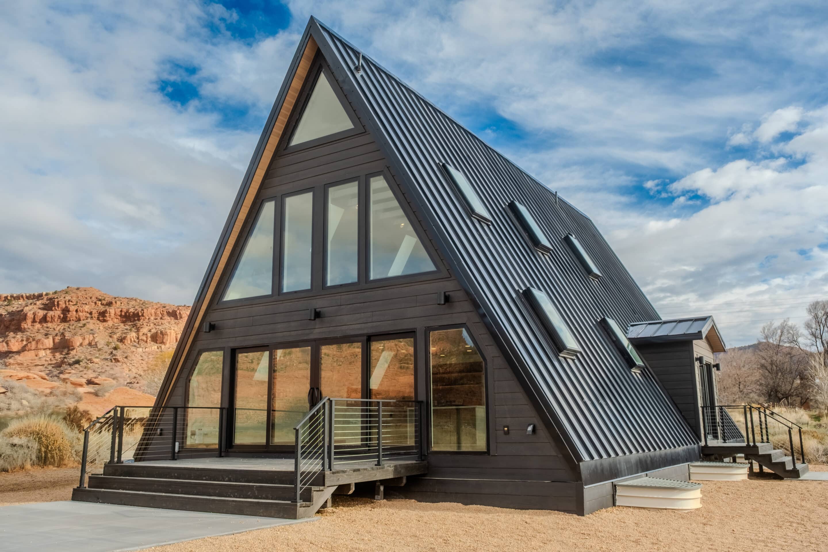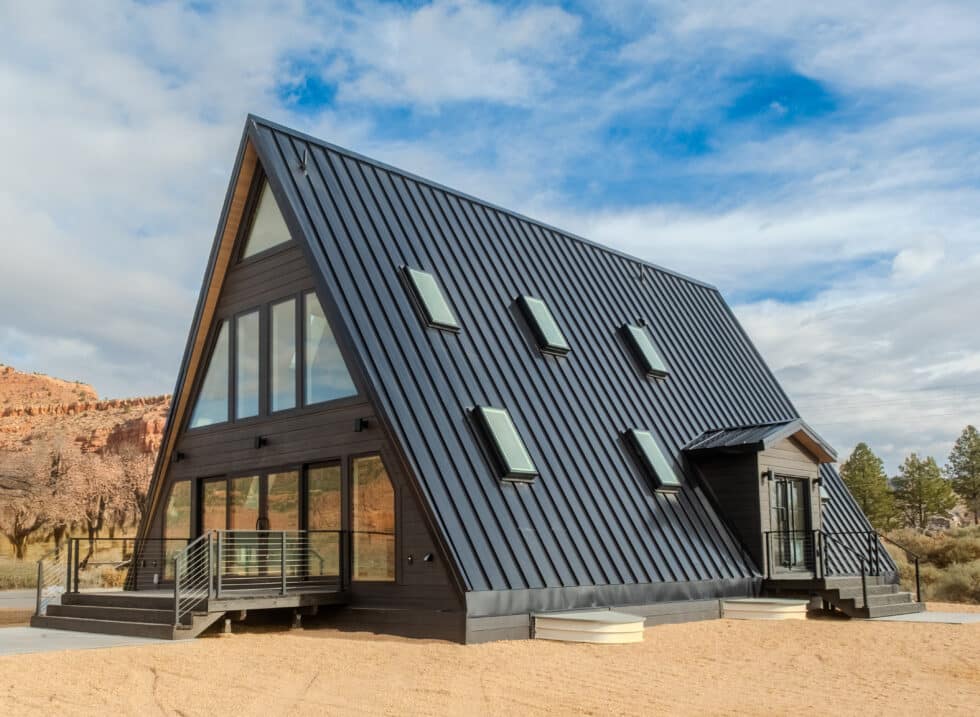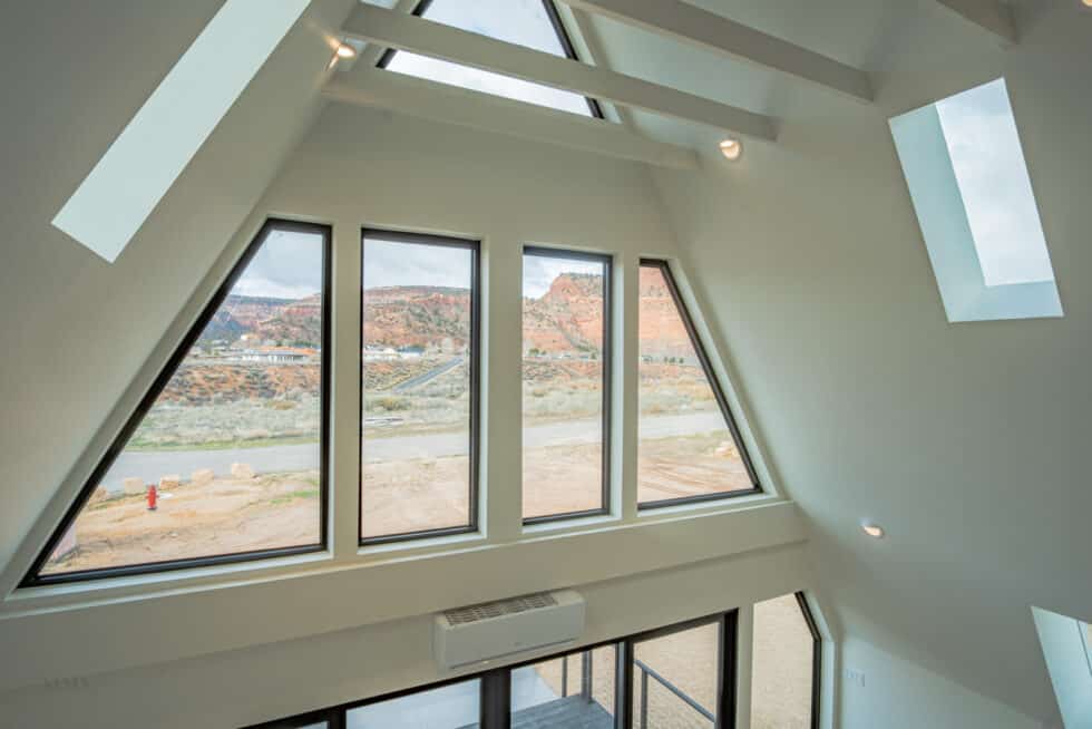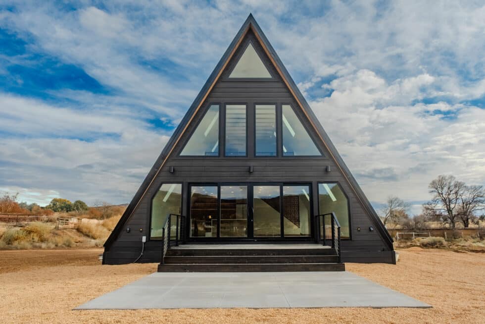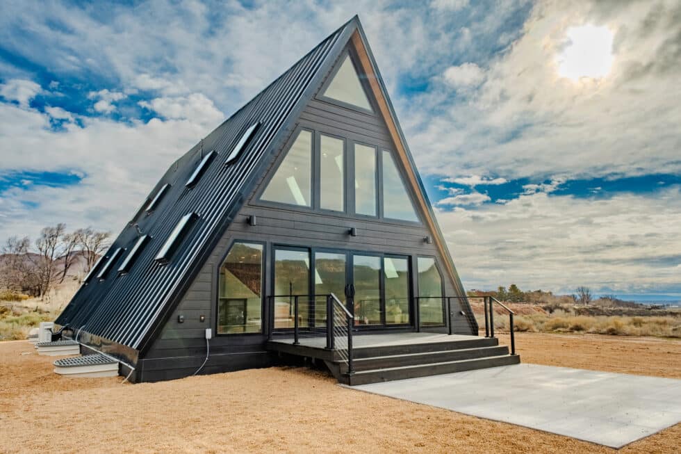 Set against the vermilion cliffs of Southern Utah, the Kanab custom home reimagines the classic A-frame with a sophisticated modern edge. Anchored by a soaring glass façade and grand metal-framed doors, the structure seamlessly dissolves the barrier between shelter and landscape. Inside, the design balances cabin warmth with contemporary minimalism, utilizing rich wood textures and a lofted layout to create a light-filled sanctuary intimately connected to the high desert.