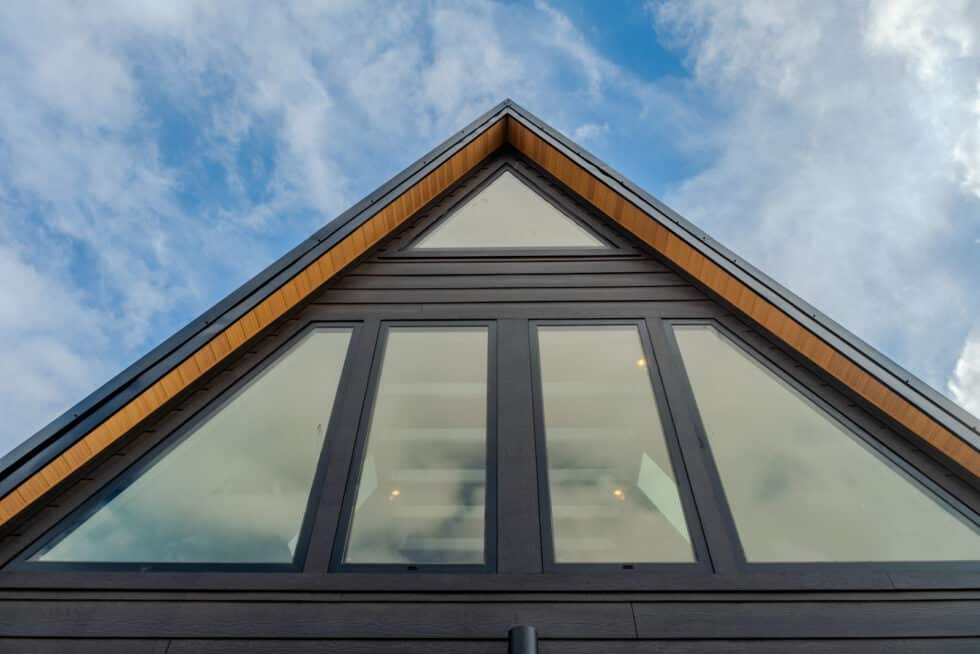 Lofted Architectural Volume: The open-concept design utilizes the A-frame’s verticality to create an airy, light-filled interior.